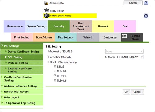 In the administrator mode, select [Security] - [PKI Settings] - [SSL Setting], then configure the following settings.