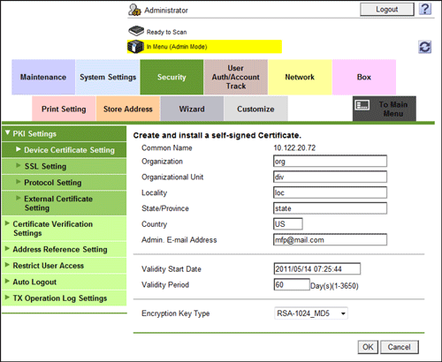 In the administrator mode, select [Security] - [PKI Settings] - [Device Certificate Setting] - [New Registration] - [Create and install a self-signed Certificate.], and enter information required for creating a certificate, then click [OK].