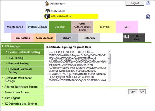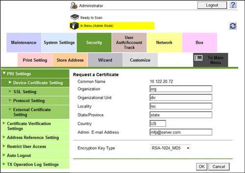 In the administrator mode, select [Security] - [PKI Settings] - [Device Certificate Setting] - [New Registration] - [Request a Certificate], and enter information required for issuing a certificate, then click [OK].