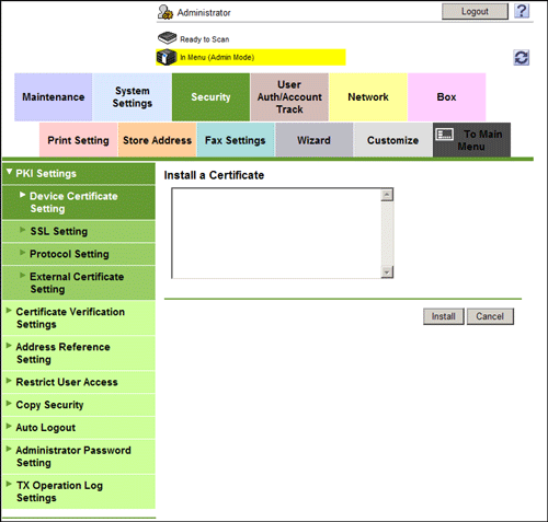 In the administrator mode, select [Security] - [PKI Settings] - [Device Certificate Setting] - [Setting] - [Install a Certificate], and paste the text data sent from the Certificate Authority (CA), and then click [Install].