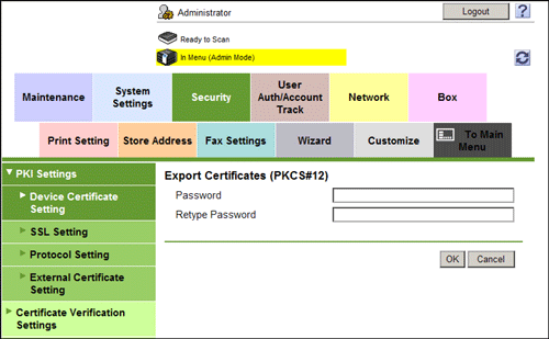 In the administrator mode, select [Security] - [PKI Settings] - [Device Certificate Setting] - [Setting] - [Export Certificates], and enter a password (using up to 32 characters), and click [OK].