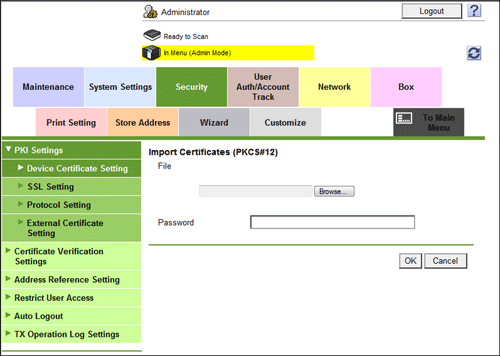 In the administrator mode, select [Security] - [PKI Settings] - [Device Certificate Setting] - [Setting] - [Import Certificates], then click [Browse] to specify the certificated to be imported.