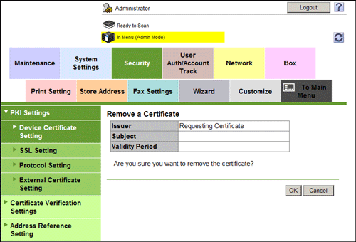 In the administrator mode, select [Security] - [PKI Settings] - [Device Certificate Setting] - [Setting] - [Remove a Certificate], then click [OK].
