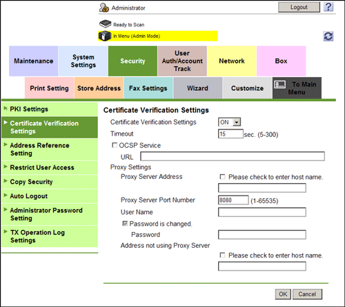 In the administrator mode, select [Security] - [Certificate Verification Settings], then configure the following settings.
