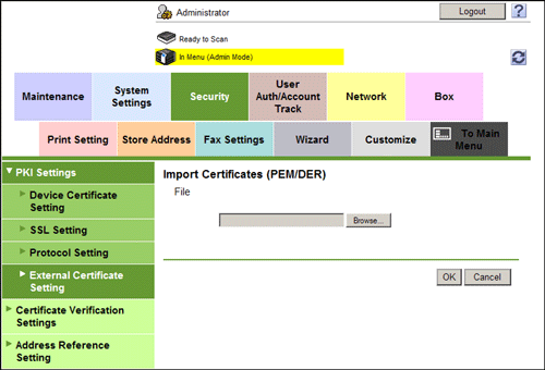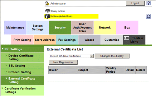 In the administrator mode, select [Security] - [PKI Settings] - [External Certificate Setting], then click [New Registration].