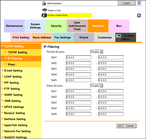 In the administrator mode, select [Network] - [TCP/IP Setting] - [IP Filtering], then configure the following settings.