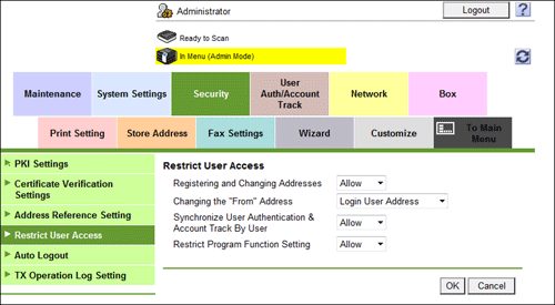 In the administrator mode, select [Security] - [Restrict User Access], then configure the following settings.