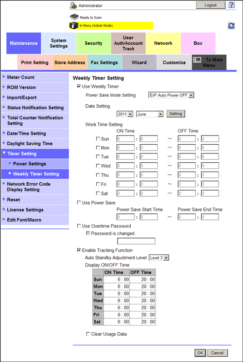 Select this check box to use the weekly timer function. Also specify the power save mode to be switched by the weekly timer, and the weekly timer schedule. The weekly timer schedule can be used with [Date Setting] and [Work Time Setting]. If the [Enable Tracking Function] check box is selected, the schedule automatically set by the tracking function is specified by default for [Date Setting] and [Work Time Setting]. More flexible operation is possible by changing the automatically set schedule as required. [ON] (selected) is specified by default. |