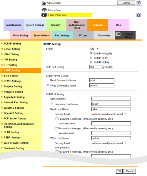 In the administrator mode, select [Network] - [SNMP Setting], then configure the following settings.
