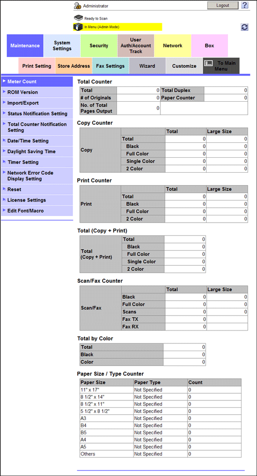 In the administrator mode, select [Maintenance] - [Meter Count] to check the information of various counters of this machine.