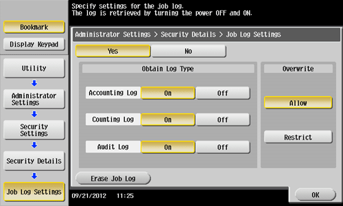 On the Control Panel, tap [Utility] - [Administrator Settings] - [Security Settings] - [Security Details] - [Job Log Settings], and configure the following setting.