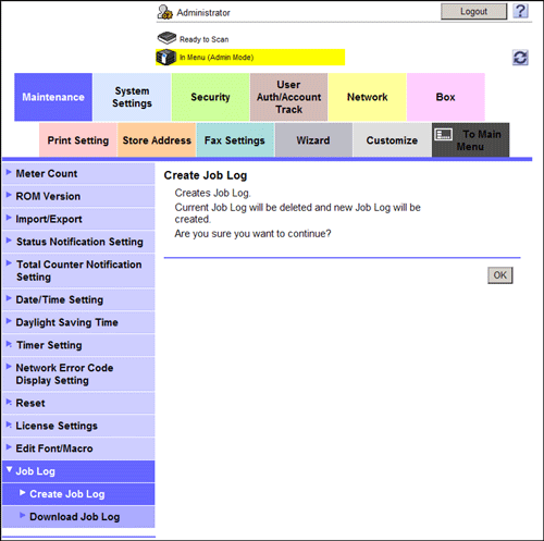 In the administrator mode, select [Maintenance] - [Job Log] - [Create Job Log], then click [OK].
