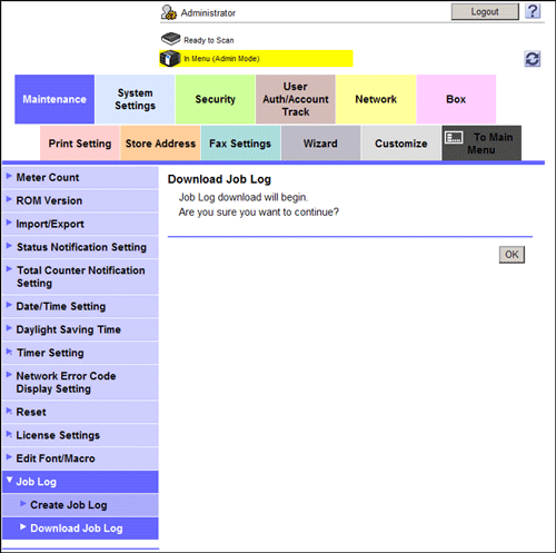 You can download logs of the jobs executed on this machine. The job log allows you to check usage, paper usage, operations and job history for each user or account.