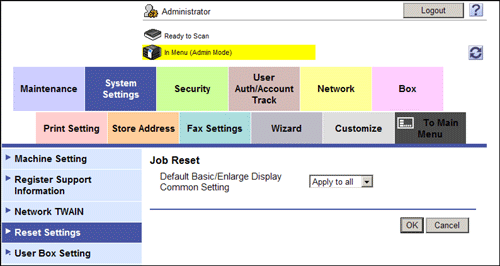 If you wish to change the settings in Normal Display and Enlarge Display at the same time, select in the administrator mode [System Settings] - [Reset Settings], and then set [Default Basic/Enlarge Display Common Setting] to [Apply to all] (Default: [Do not Apply]).