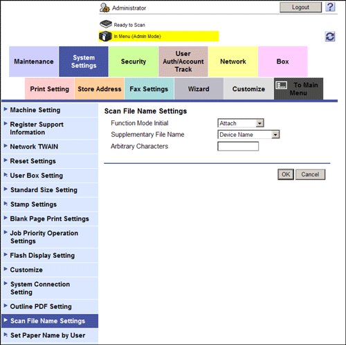 In the administrator mode, select [System Settings] - [Scan File Name Settings], then configure the following settings.
