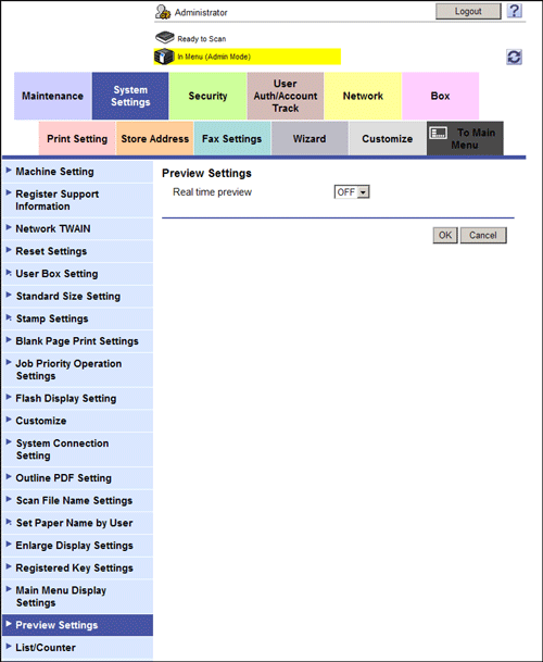 In the administrator mode, select [System Settings] - [Preview Settings], and set [Real time preview] to [ON] (Default: [OFF]).