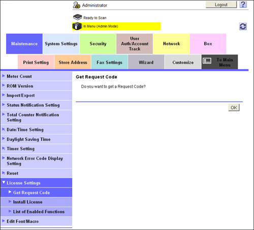 In the administrator mode, select [Maintenance] - [Licence Settings] - [Get Request Code], then click [OK].