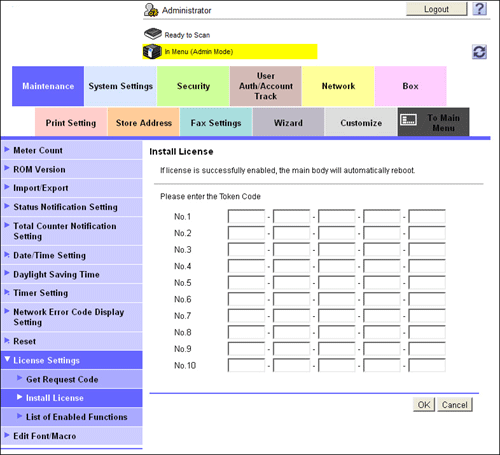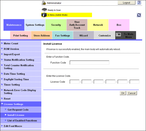 In the administrator mode, select [Maintenance] - [License Settings] - [Install License], and enter the function and license codes, then click [OK].