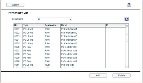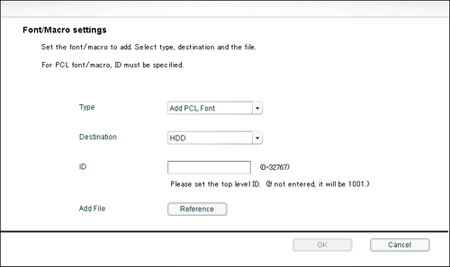 [ID] | Enter a font or macro ID number for PCL font or PCL macro. If it is not entered, the available ID is assigned automatically. |