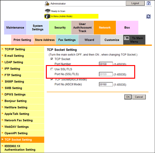 In the administrator mode, select [Network] - [TCP Socket Setting], then configure the following settings.