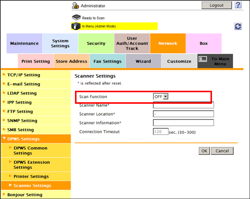 In the adminisrator mode, select [Network] - [DPWS Settings] - [Scanner Settings], then set [Scan Function] to [ON] (Default: [OFF]).