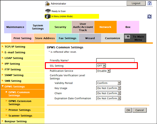 In the administrator mode, select [Network] - [DPWS Settings] - [DPWS Common Settings], then set [SSL Setting] to [ON] (Default: [OFF]).