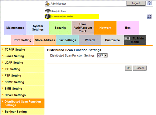 In the administrator mode, select [Network] - [Distributed Scan Function Settings], and set [Distributed Scan Function Settings] to [ON] (Default: [OFF]).
