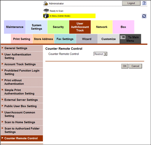 In the administrator mode, select [User Authentication/Account Track] - [Counter Remote Control], and set [Counter Remote Control] to [Allow] (Default: [Restrict]).