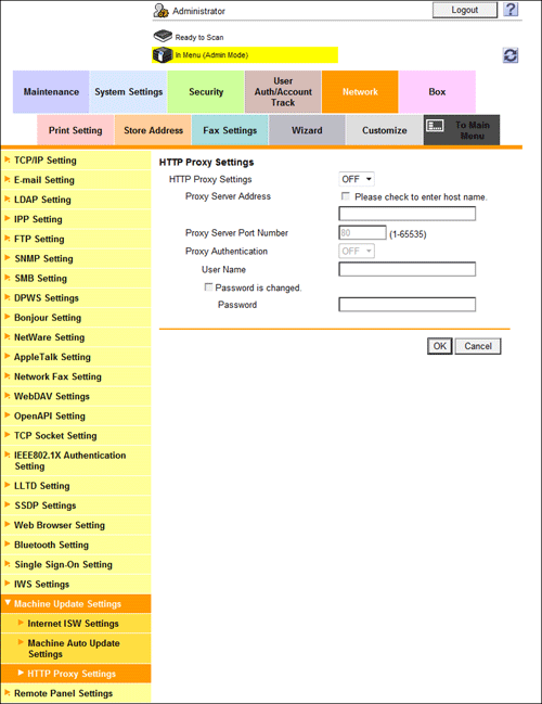 If necessary, in the administrator mode, select [Network] - [Machine Update Settings] - [HTTP