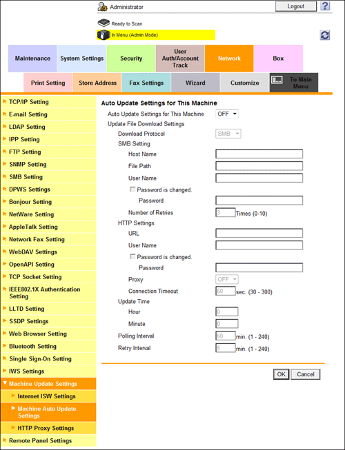 In the administrator mode, select [Network] - [Machine Update Settings] - [Machine Auto