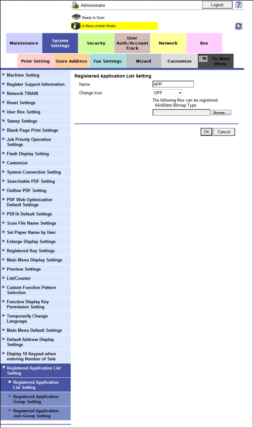 In the administrator mode, select [System Settings] - [Registered Application List Setting] - [Registered Application List Setting], then configure the following settings.