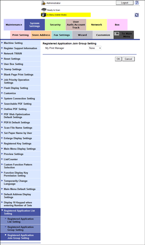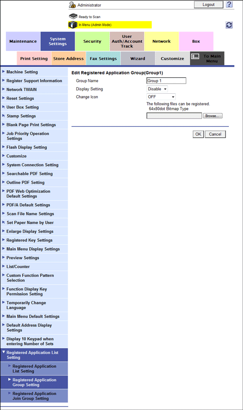 In the administrator mode, select [System Settings] - [Registered Application List Setting] - [Registered Application Join Group Setting], then select the application to be registered in the group and click [Edit].