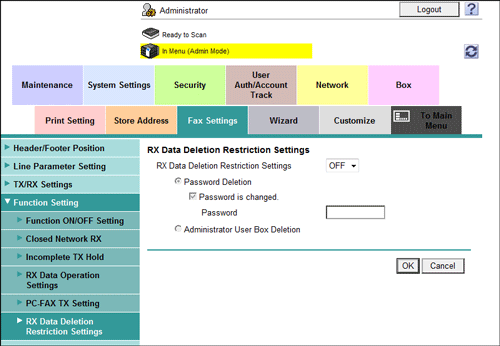 In the administrator mode, select [Fax Settings] - [Function Setting] - [RX Data Deletion