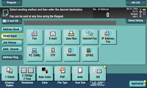 [E-mail] | Enter a destination E-mail address when scanned original data is sent by E-mail attachment. |