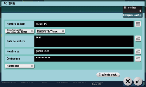 En el panel táctil, busque el ordenador al que desea enviar un archivo y seleccione una carpeta compartida de destino. Cuando aparezca la pantalla de autenticación, introduzca el nombre y la contraseña de un usuario que tenga privilegios de acceso a la carpeta seleccionada. Después de la autenticación, se introduce automáticamente el [Nombre de host] o la [Ruta de archivo]. La función Referencia puede fallar en las siguientes condiciones.