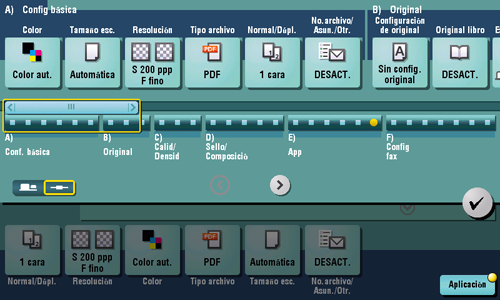 [App] | Configure las opciones de la aplicación como, por ejemplo, notificación de la ubicación de guardado de los datos del original por correo electrónico y cambio de la posición de encabezado del fax. |