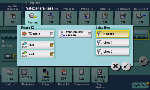 [Selecc. línea] | Si se utilizan dos líneas, seleccione la línea utilizada para enviar un fax. Para el uso general, utilice [Línea 1]. Si se ha seleccionado [Ninguna], se utiliza cualquier línea que no esté ocupada para la transmisión. |