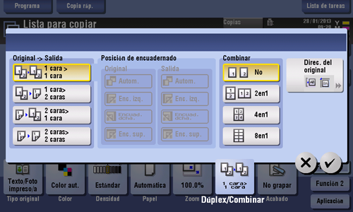 [Original > Salida] | Seleccione una combinación del original que va a cargarse (original de 1 cara u original de 2 caras) y el método de copia (copia de 1 cara o copia de 2 caras). Para obtener más información, consulte Aquí. |