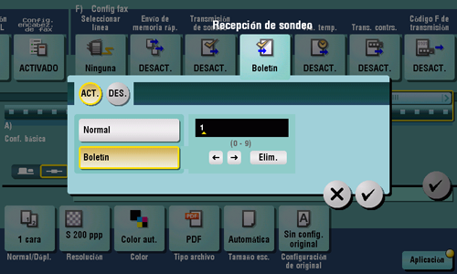[Boletín] | Seleccione esta opción para recibir un archivo almacenado en una carpeta de usuario de boletín. Introduzca el número de carpeta usuario de la carpeta de usuario de boletín en la máquina de destino donde está almacenado el archivo con el teclado. Para mostrar el teclado, toque el área de entrada numérica. |