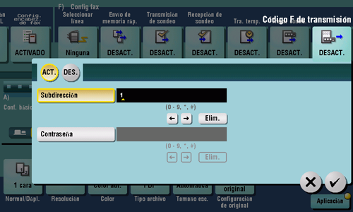 [ACT.]/[DES.] | Seleccione [ACT.] para especificar Código F de transmisión. |