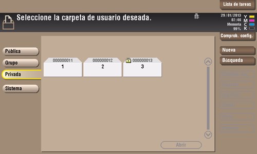 Para acceder a un archivo de esta carpeta de usuario, seleccione la carpeta de usuario deseada y, a continuación, toque [Abrir].
