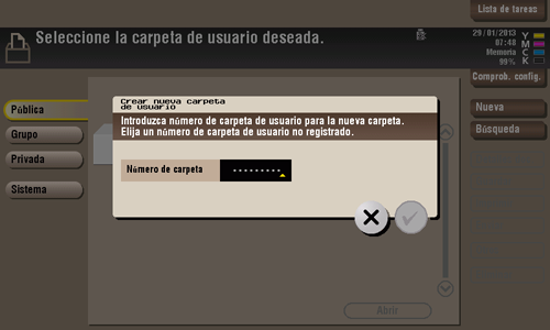 Desde el Teclado, introduzca el número de la carpeta de usuario que desea registrar y toque [Aceptar]. Para mostrar el teclado, toque el área de entrada numérica.