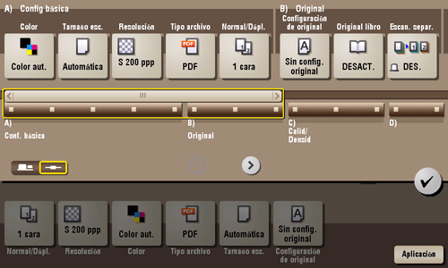[App] | Configura las opciones de la aplicación para borrar las sombras producidas al escanear un original y para resaltar los bordes de la imagen. |