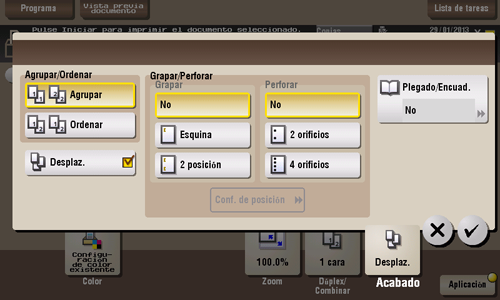 Si se ha instalado una unidad de acabado o el separador de trabajos JS-506, las hojas impresas se expulsan y apilan una encima de otra, con cada juego de copias o páginas escalonado para separarlas.