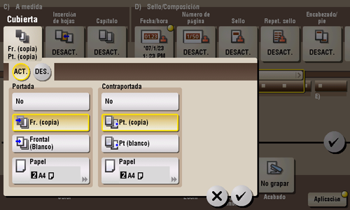 [Portada] | Inserta una cubierta frontal. [Papel]: seleccione el papel usado para la cubierta. Utilice hojas del mismo tamaño para la portada y el cuerpo, y apílelas en la misma orientación. En la ineo+ 554e: puede seleccionar la bandeja de papel de la unidad de inserción posterior cuando se selecciona [Delante (blanco)] con la unidad de inserción posterior instalada.