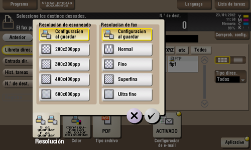 [Resolución de escaneado] | Seleccione la resolución que se debe utilizar para escanear y enviar el original. Para utilizar las funciones Transmisión de e-mail, Transmisión SMB, Transmisión FTP o Transmisión WebDAV, se selecciona la siguiente resolución para el envío.