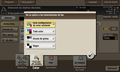 [Todo color] | Envía un archivo a todo color, independientemente del modo seleccionado para guardarlo. Seleccione esta opción para enviar archivos y fotos a color. |