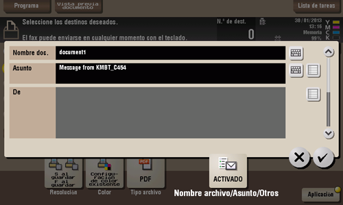 Al enviar por correo electrónico, puede especificar el texto del asunto y del mensaje de un correo electrónico y modificar la dirección de correo electrónico del remitente (dirección "De").