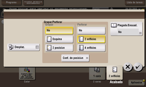 [Conf. de posición] | Seleccione una posición para perforar. Si la posición de perforación se ha ajustado a [Auto], la posición para perforar se determina de forma automática en función de la dirección del archivo de impresión. |