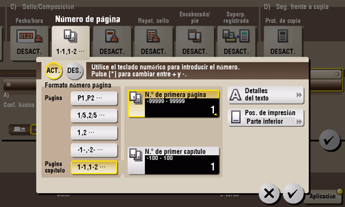 Seleccione la posición y el formato del sellado, y añada los números de página y capítulo. Los números de página y de capítulo se imprimen en todas las páginas.